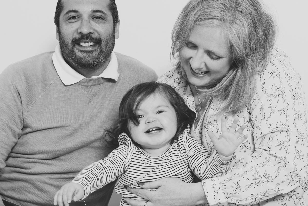 Candid family photograph of young girl having fun in studio with her mom and dad.